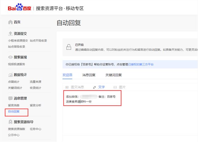 熊掌號的后臺有個自動回復的功能,把你需要引流的東西寫進去即可,只要粉絲一關注你,那么他就會自動回復這段話給粉絲,這樣粉絲看到了,他有興趣的話就會加你的聯(lián)系方式。