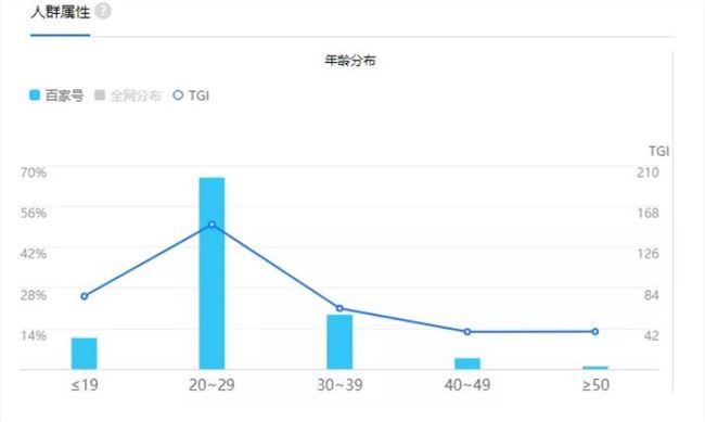 那么目前百家號這個平臺的粉絲年齡主要集中在20- 29 歲,占了整個平臺的66.37%,30- 39 歲的粉絲占了19.35%,除此之外,還有一些小部分的群體。那么從下面這張圖就可以看出,百家號這個平臺的粉絲多以年輕人為主。