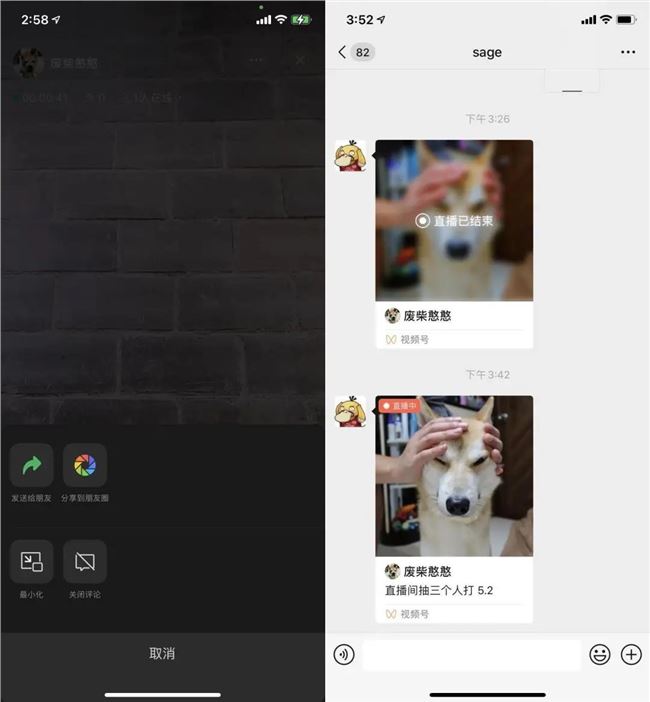 通過右上角的「...」,用戶可以將直播分享至好友或朋友圈,也可以關(guān)閉評論或?qū)χ辈ゴ翱谶M(jìn)行最小化等操作。最小化的直播窗口和視頻聊天窗口最小化的效果一致,用戶可以拖動窗口改變其位置,再次點(diǎn)擊即可重新回到直播界面。