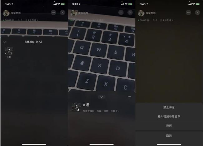 在主播端,主播點(diǎn)擊在線觀眾后可以看到觀眾的 ID 和頭像,主播也可以對用戶進(jìn)行禁止評論,移入視頻號黑名單或投訴等操作。